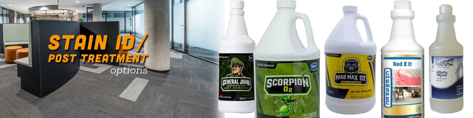 For urine, feces, blood, grass, soil, or other organic spot or stain issues, try CPS Mad Max Urine Treatment or CPS Scorpion O2 Stabilized 7.9% Hydrogen Peroxide.